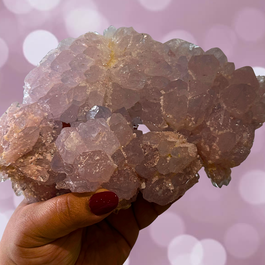 The Natural Pineapple Pink Raw Quartz Crystal is a rare and unique variety of quartz known for its pink hue and distinctive pineapple-like surface texture. It is a naturally occurring crystal that forms in clusters, with smaller crystal terminations covering the larger ones, resembling the bumpy surface of a pineapple. This variety of quartz often originates from Madagascar, a region renowned for its high-quality and energetically vibrant crystals.